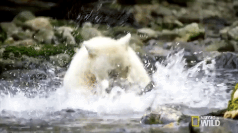 Kermode bears are known for their creamy white fur, but they are not albinos. Rather, they are the result of a double recessive gene that is found only in their subspecies. Like other bears, Kermode bears enjoy hunting for salmon in streams, and their fur actually gives them a distinct advantage. The whiteness is less visible to the swimming fish, allowing them to be, on average, 30 percent more effective hunters than their darker-furred counterparts.